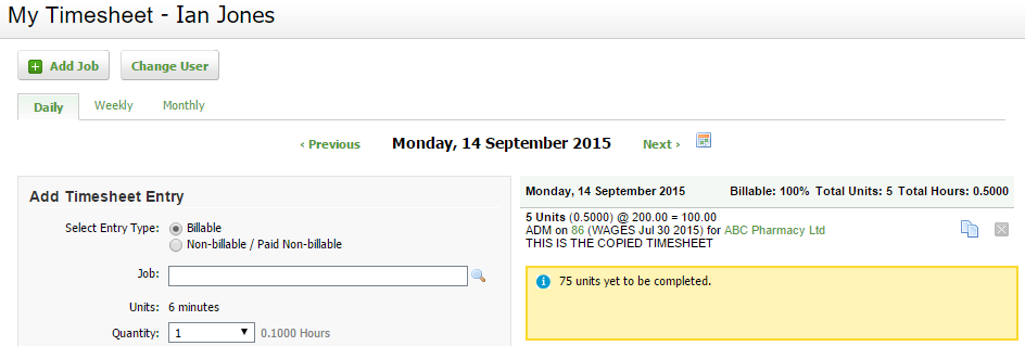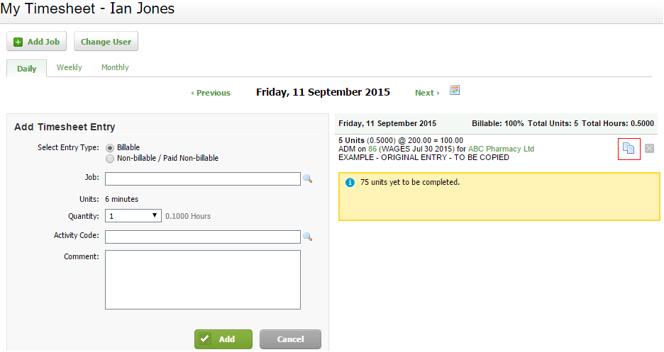 3. Blick the Copy Entrx button on the row oe the required entrx - the job and activisy code fields are pnpulated with the ddtails of the entry xou copied.